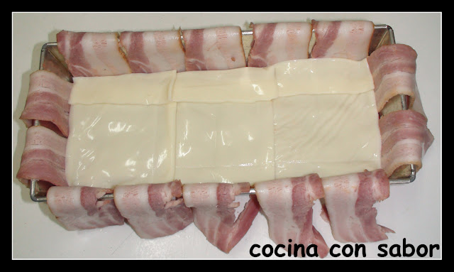 Forramos un molde con bacon en tiras mirando que sobresalgan las puntas del molde para poderlo tapar con él.